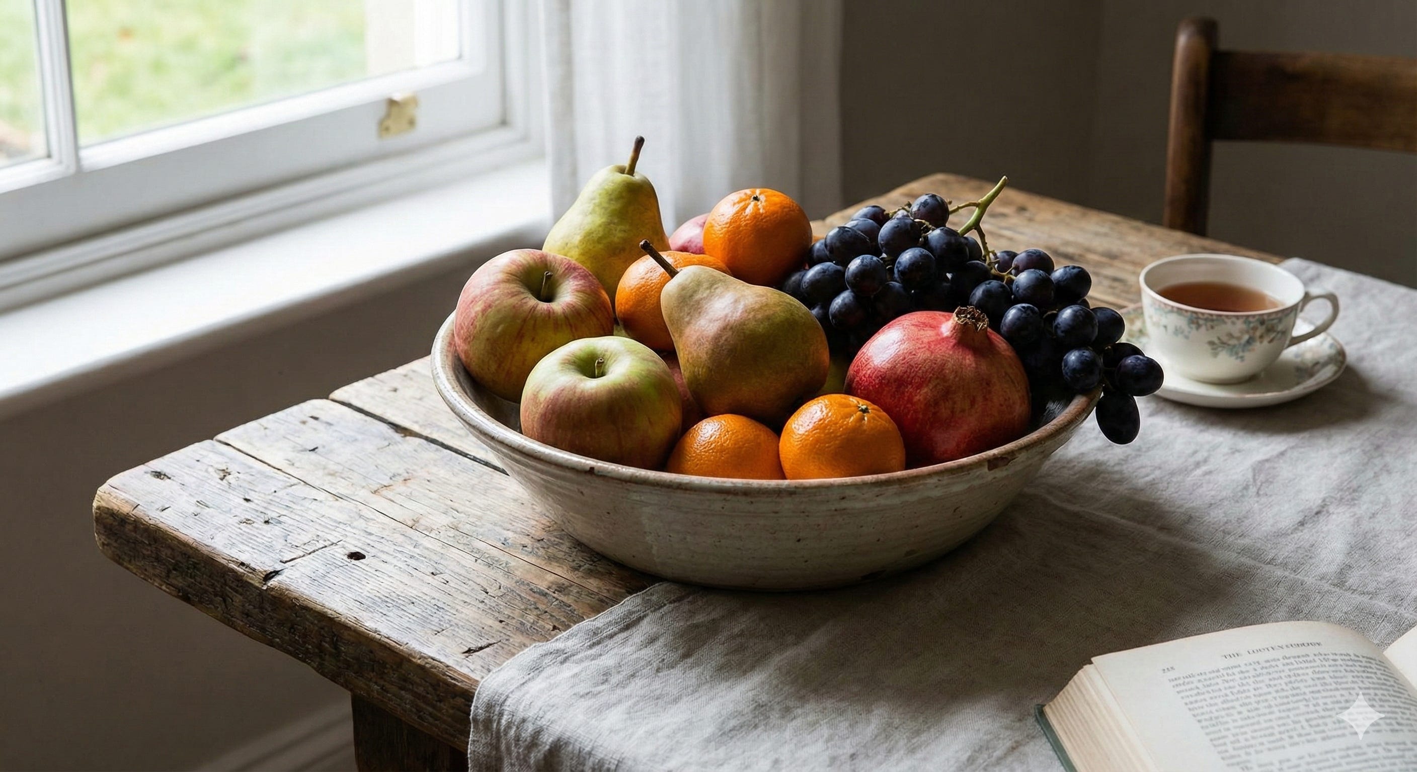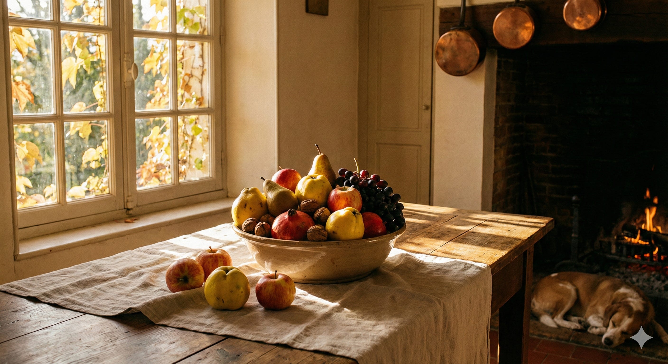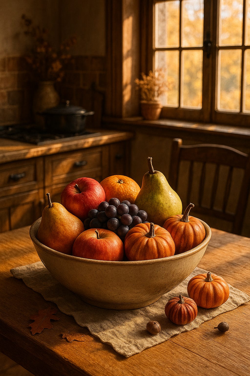 Représente un bol de fruits sur une table. La scène se déroule dans une jolie cuisine rustique. La table où se trouve le bol est éclairée par un soleil automnal dont la lumière filtre à travers la fenêtre que tu représenteras. Les fruits sont de saison (l’automne) et l’ensemble de l’image dégage une ambiance douce et chaleureuse.Et là, la magie opère. Que ce soit chez OpenAI ou chez Google, le résultat est bluffant. On passe de “l’image stock” à une véritable proposition artistique.