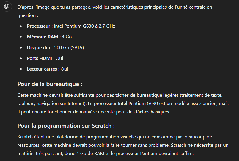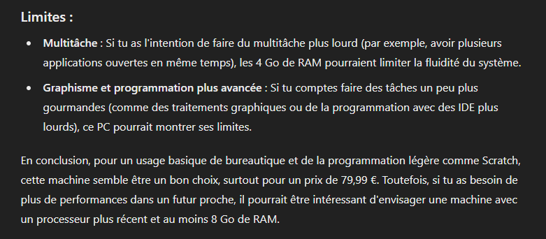 Je fais appel à tes compétences en informatique. Penses-tu que cette machine est adaptée à la bureautique et un peu de programmation, comme Scratch ?Et là, sous mes yeux ébahis, GPT m’a encore délivré une réponse claire et précise ! Voici ce que ça a donné :