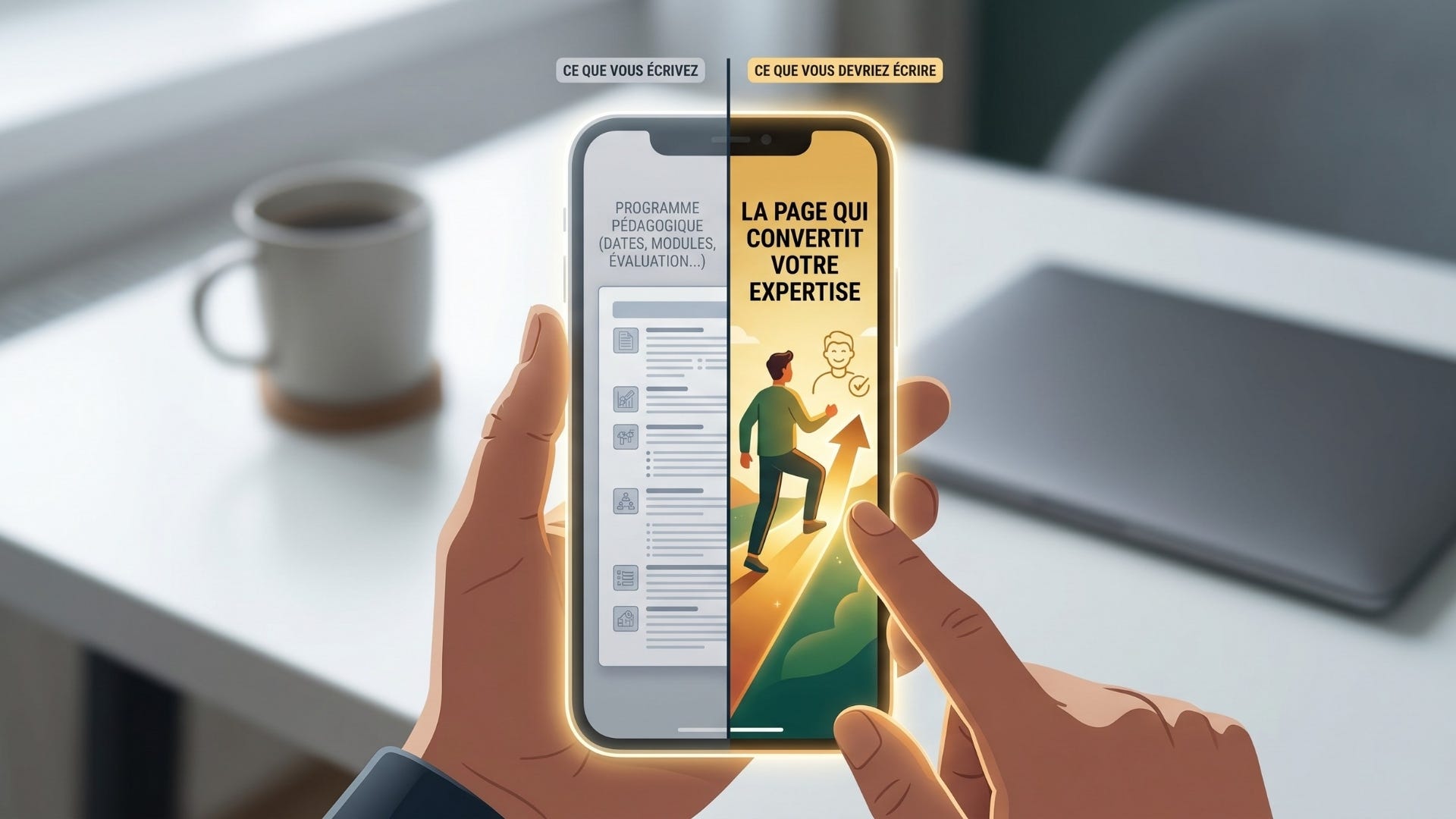 Or vous avez choisi ce métier précisément parce que vous aimez transmettre, pas parce que vous aimez vendre. Du coup, quand vous vous asseyez pour écrire cette page, deux choses se passent :