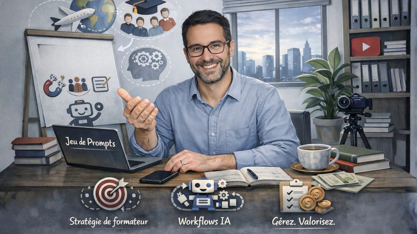 La ligne éditoriale va se spécialiser. Fini les prompts pour le jardinage ou le bricolage du dimanche ! Désormais, chaque article de ce Substack vous apportera la preuve concrÚte de la maniÚre dont un formateur indépendant peut structurer son activité de A à Z sans lourdeur.